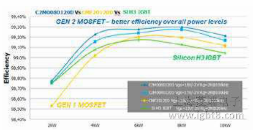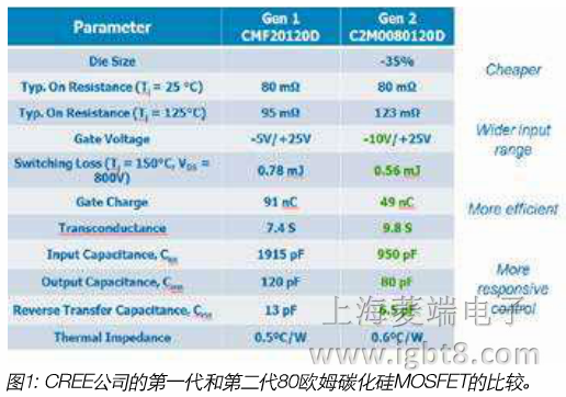 第一代和第二代80歐姆CREE MOSFET與最新代Si IGBT相比,碳化硅MOSFE可以由Ggs=15V/-2V驅(qū)動。