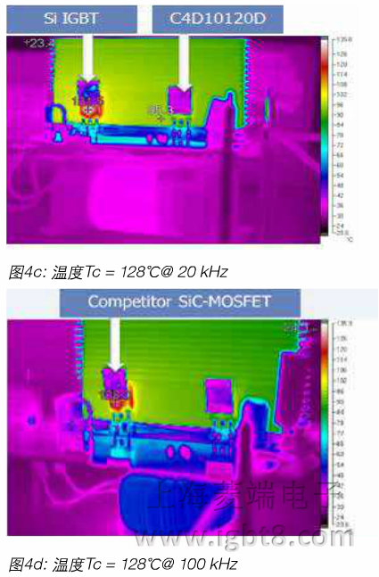 此外,在相同轉(zhuǎn)換器中比較了競爭者的SiC-MOSFET。在6d圖像中可以看出結(jié)果。C2M0080120D比CWIF20120D冷了15℃,比競爭對手的SiC-MOSFET冷了近38'C。實(shí)際上CMF20120D溫度低了約13C。