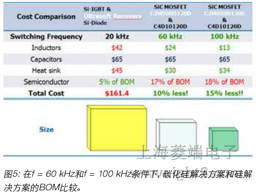 現(xiàn)在比較BOM時,下列事實(shí)可以成立.雖然功率半導(dǎo)體的百分比只有硅基解決方案的5%,但最終整體成本較高。其中一個原因是由于較高的頻率可以減少電感,另一個原因是開關(guān)損耗相當(dāng)?shù)停虼嗽赟iC-MOSFET的情況下有更好的熱成像,從而有可能減少散熱器的大小和成本。如果開關(guān)頻率提高到f= 100 kHz,碳化硅基解決方案的BOM成本可以降低5%。顯著減少的整個系統(tǒng)的尺寸和重量也必須考慮在內(nèi)。